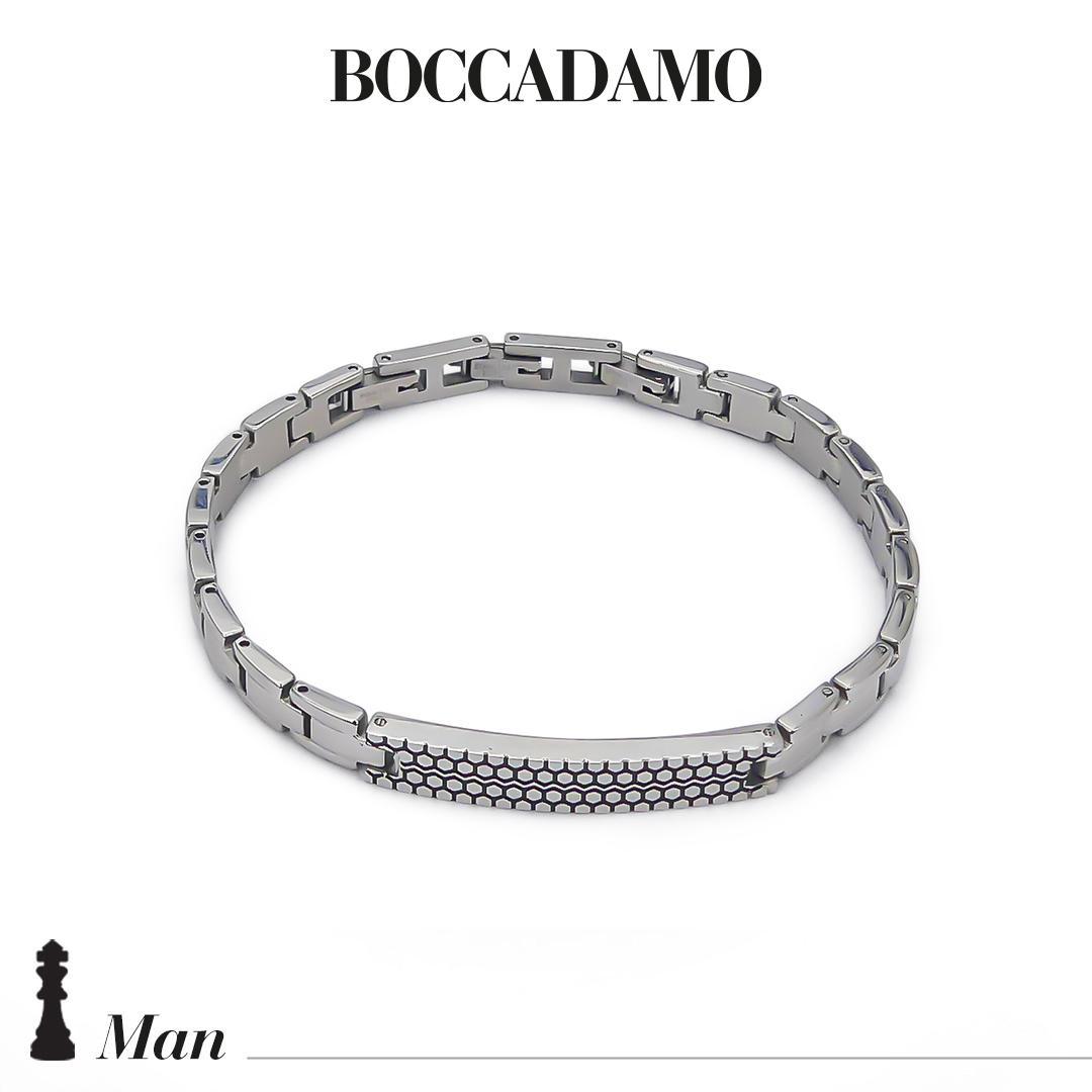 Brazalete modular de acero con acabados en PVD y placa central con surcos simétricos.