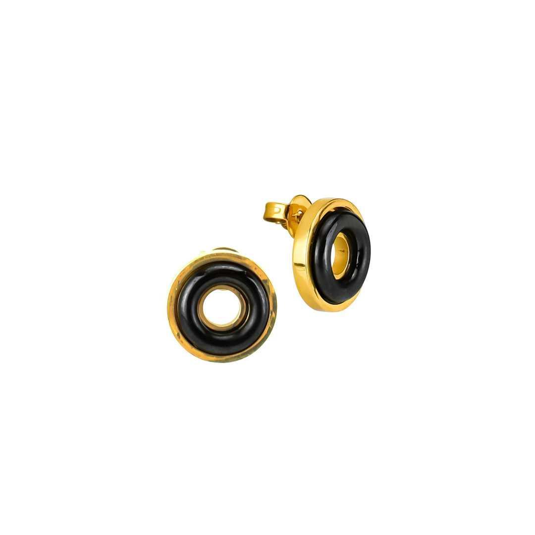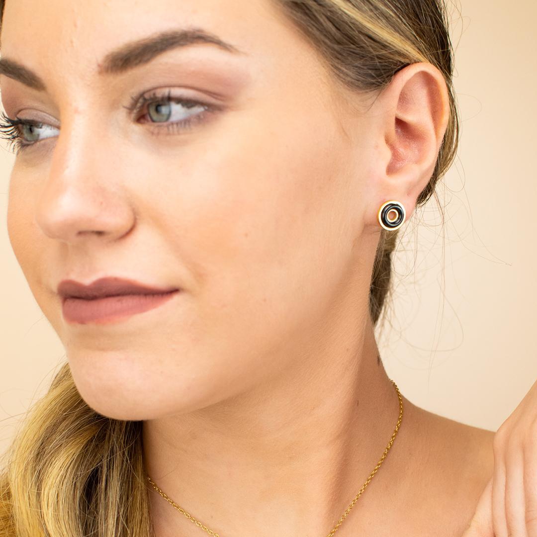 Pendientes de botón en acero rodiado bañados en oro amarillo, forma de rosquilla en cerámica de color negro.