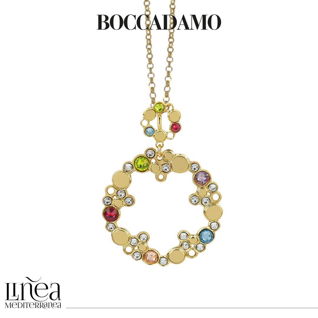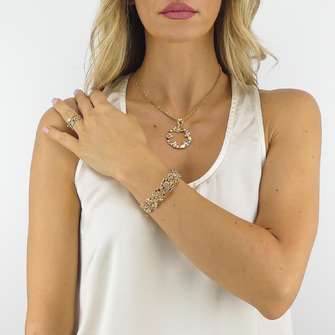 Collar roló bañado en oro amarillo con gancho y colgante circular decorados con cristales de color azul denim, melocotón, aguamarina, amatista clara, escarlata y verde citrino.