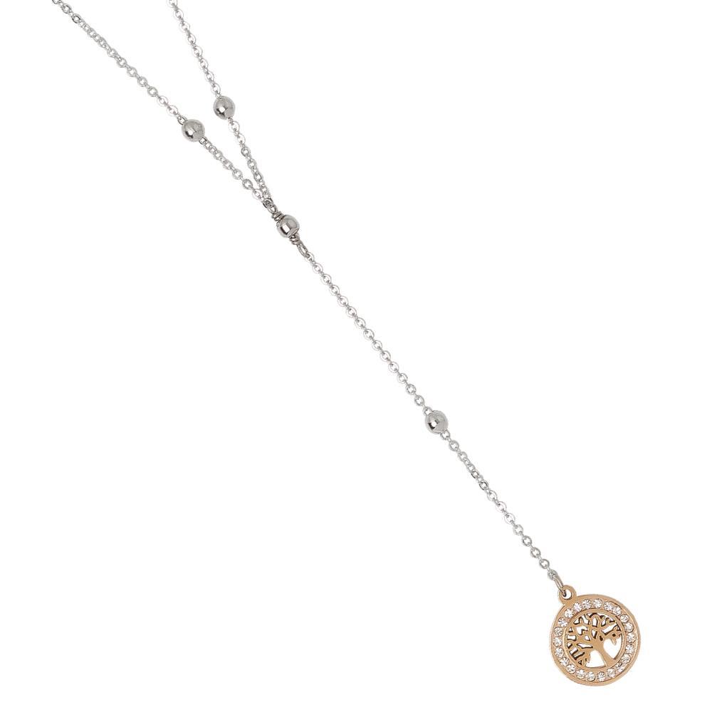 Collar rodiado en Y con colgante circular que encierra un árbol de la vida bañado en oro rosa perfilado con un pavé de strass.