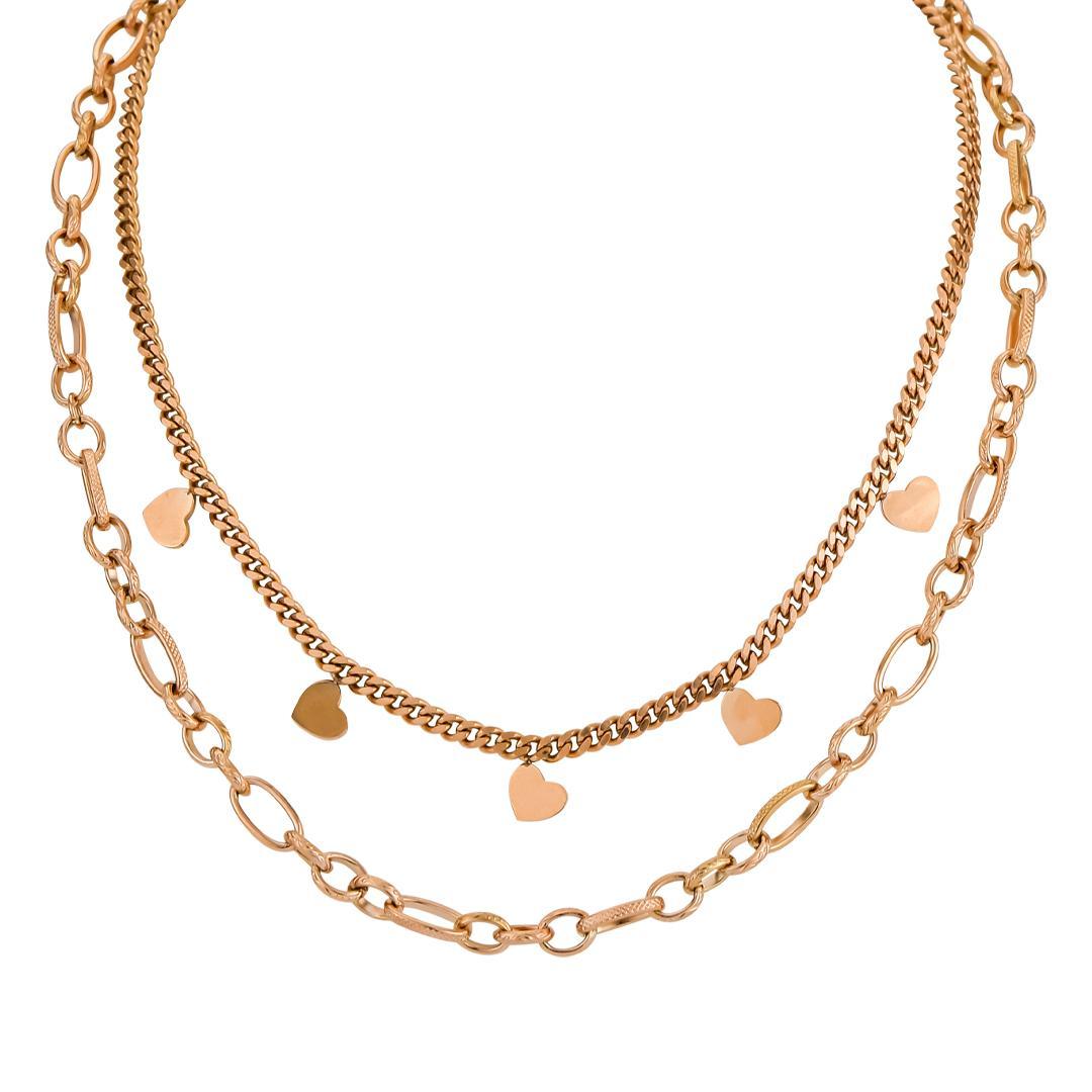 Collar bañado en oro rosa con cadena forzada larga estriada mixta y cadena corta groumette diamantada pequeña con colgantes de corazones.