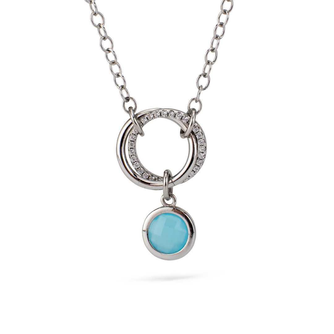 Collar rodiado con doble colgante circular, uno liso y otro con circonitas y elemento circular con piedra color aguamarina.