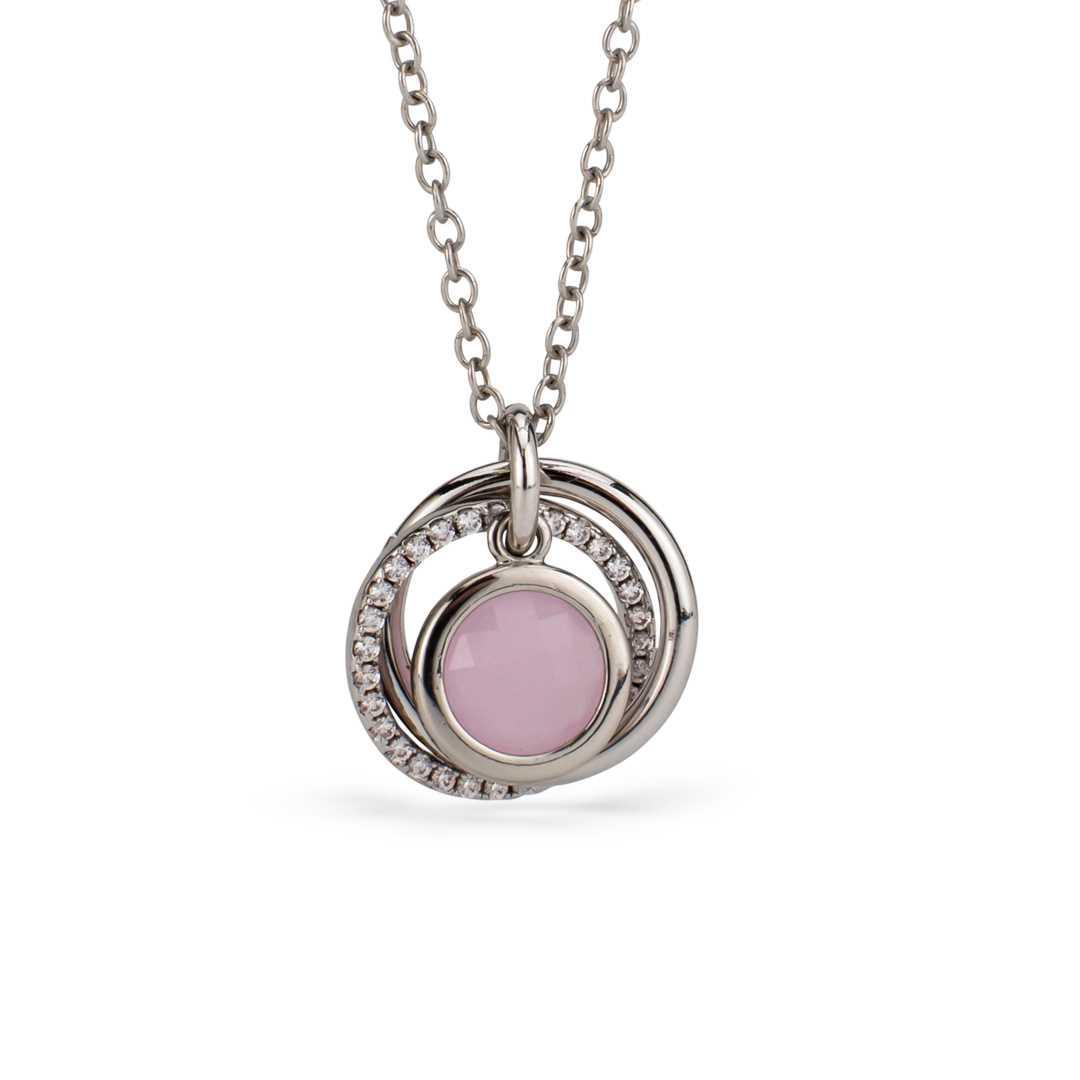 Collar rodiado con colgante compuesto por tres elementos circulares concéntricos, uno liso, otro con circonitas y otro con piedra de cuarzo rosa.