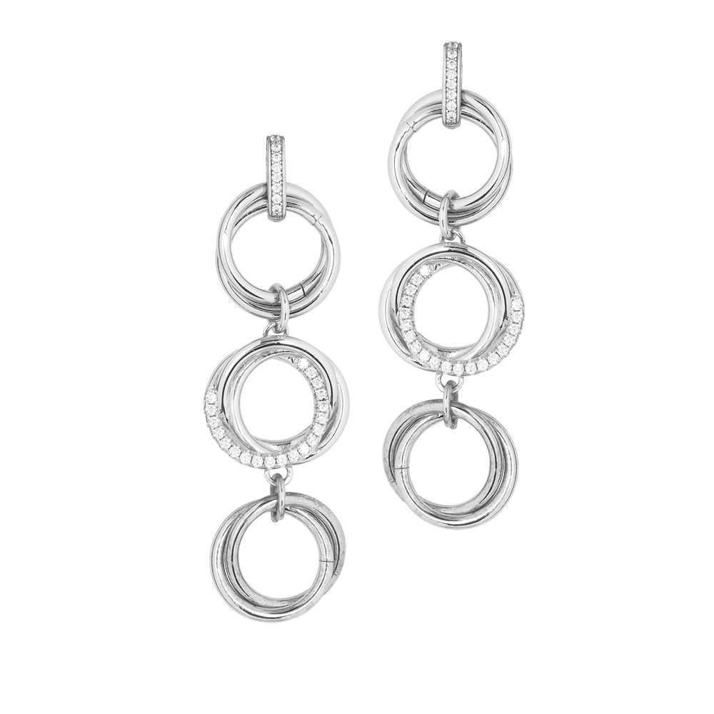 Pendientes de plata rodiada con cierre de mariposa y circonitas, y colgante compuesto por dos grupos de círculos entrelazados lisos (diámetro cm 1,7) y grupo central con circonitas (diámetro cm 2). Longitud cm 5,5.