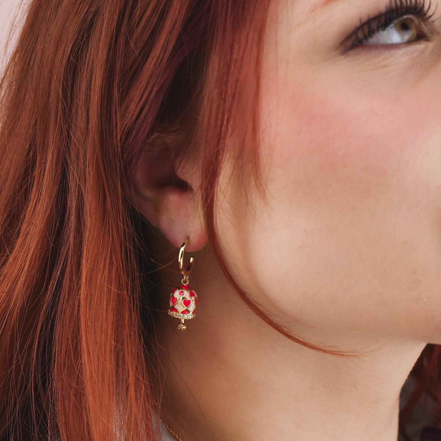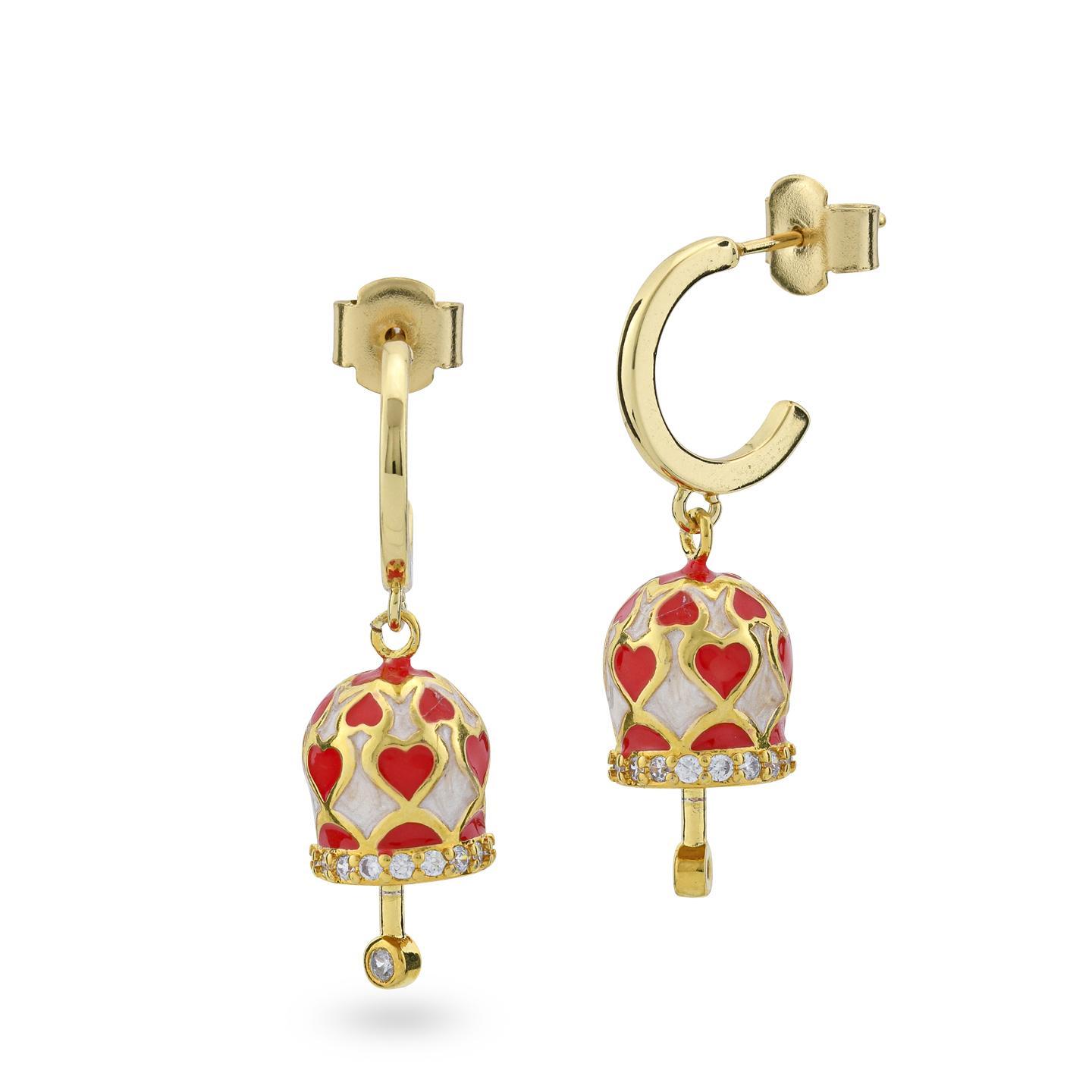 Pendientes con colgantes de campanilla en bronce bañado en oro amarillo con corazones rojos sobre base blanco perlado, adornados con circonitas.