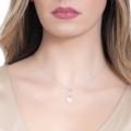 Collar de plata rodiada con colgante compuesto por dos elementos. Uno circular decorativo bañado en oro rosa (7 mm) perfilado de circonitas (1 cm) y el segundo con un interior de nácar perfilado con circonitas (1 cm). Longitud 38 cm, extensible hasta 43,5 cm.