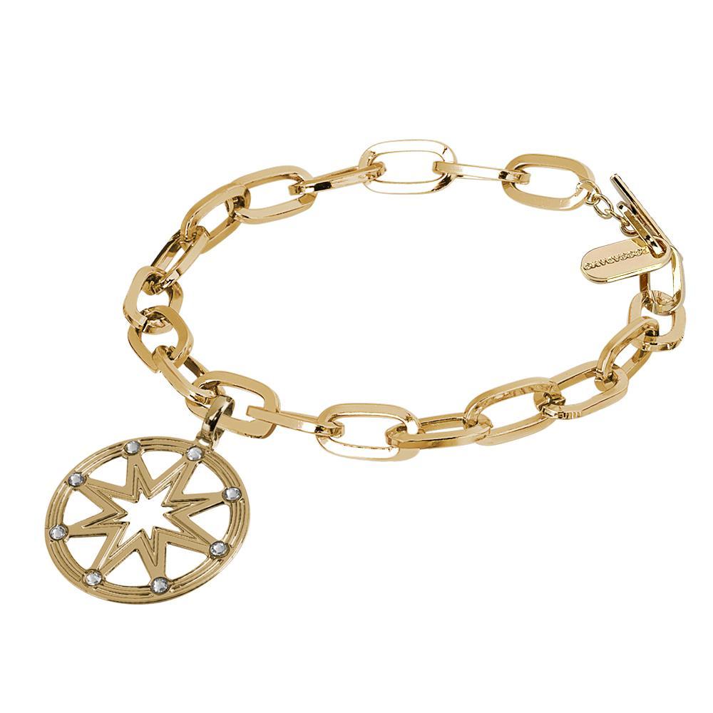 Pulsera bañada en oro amarillo con eslabones rectangulares y colgante circular que encierra la rosa de los vientos decorada con cristales
