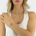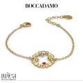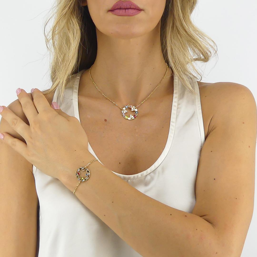 Pulsera roló bañada en oro amarillo y elemento central con cristales de color azul denim, melocotón, aguamarina, amatista clara, escarlata y verde citrino.