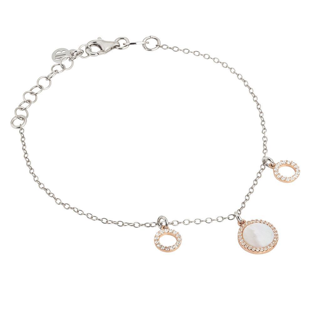 Pulsera de plata rodiada con charms circulares bañados en oro rosa y perfil de circonitas (diámetro 7 mm), elemento central con interior de nácar (diámetro 1 cm).  Longitud 17 cm, extensible hasta 20,5 cm.
