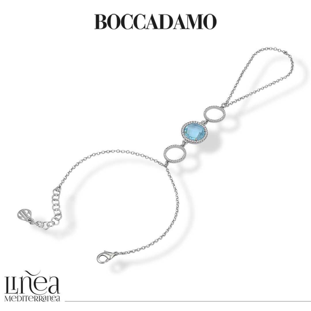 Pulsera de cadena con anillo rodiada, decoración central compuesta por cristal facetado color aguamarina y círculos de circonitas.
