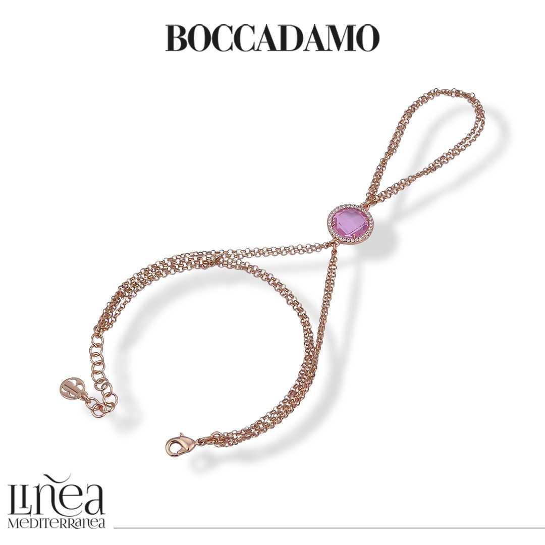 Pulsera de cadena doble con anillo bañada en oro rosa, cristal central facetado color rosa y circonitas.