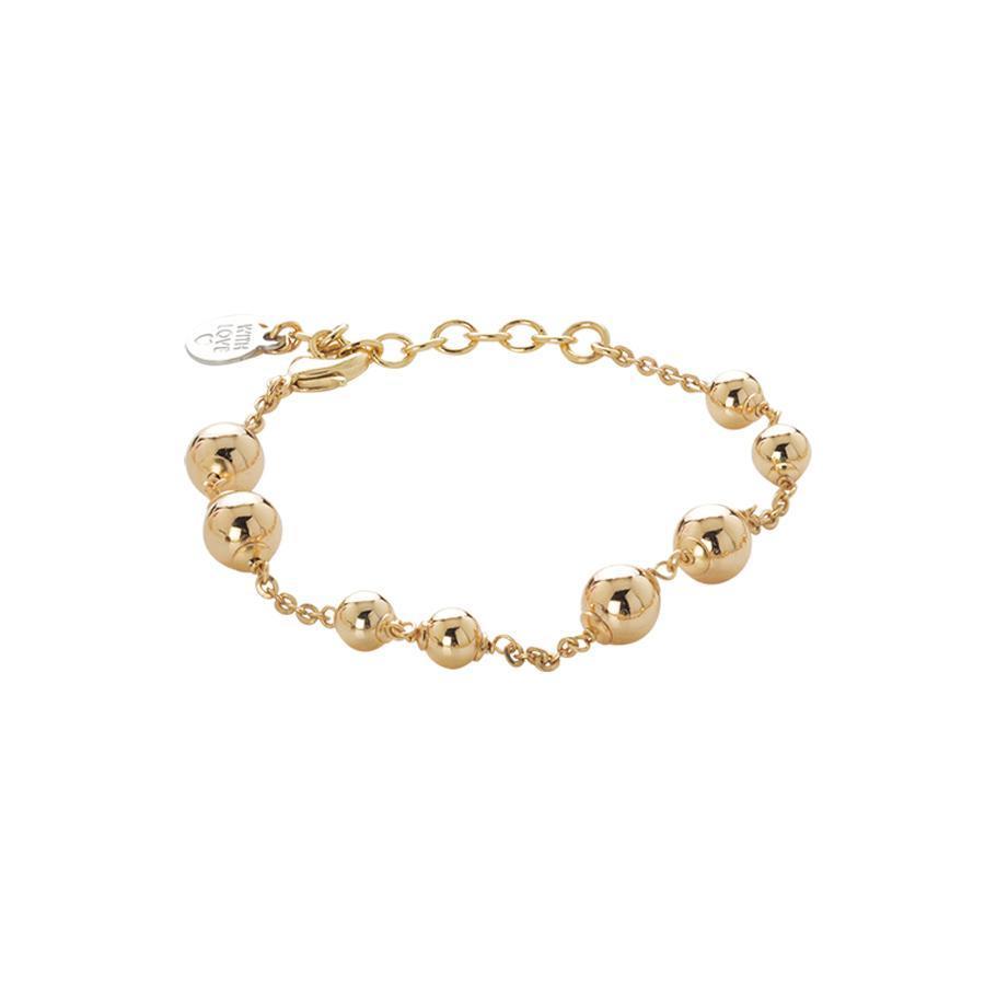 Pulsera de bronce bañada en oro amarillo con esferas doradas (6 mm y 8 mm). Longitud 17 cm, extensible hasta 20,5 cm.