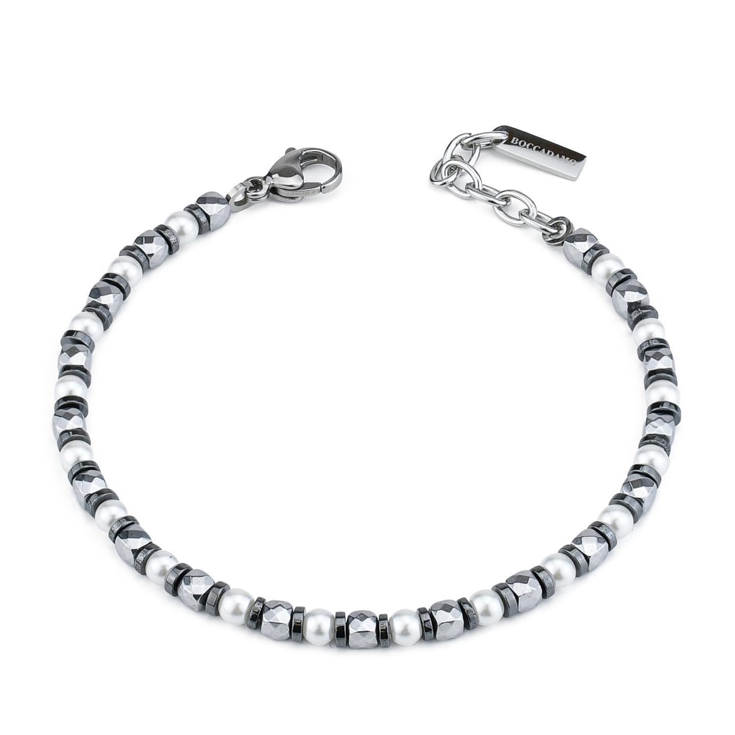 Pulsera de acero rodiado con cubos de piedras naturales y esferas de perlas sintéticas.