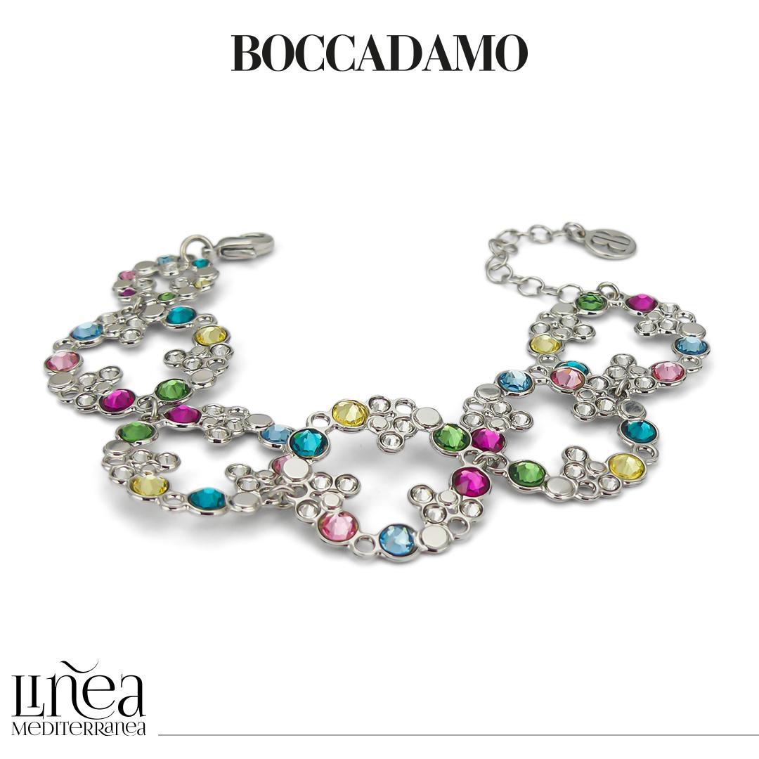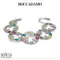 Pulsera semirrígida rodiada con módulos circulares decorados con cristales de color aguamarina, azul circón, jonquil, erinite, fucsia y rosa claro.