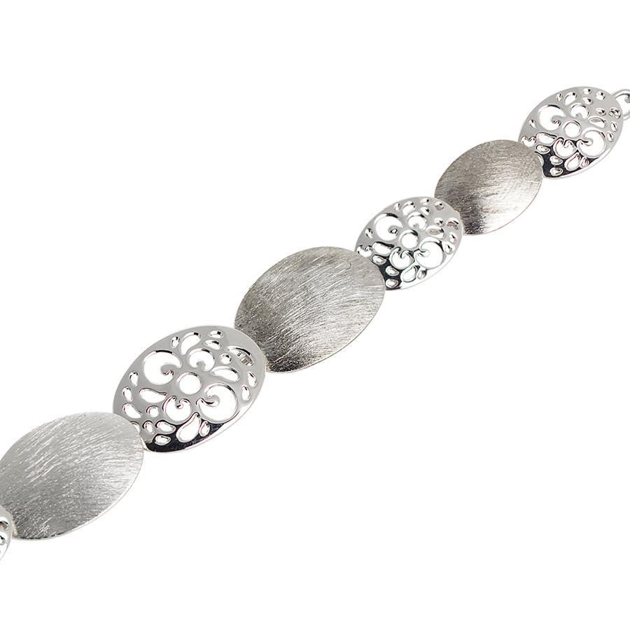 Pulsera semirrígida de bronce rodiado con óvalos de superficie rayada alternados con óvalos calados. Longitud 16,5 cm, extensible hasta 20 cm.